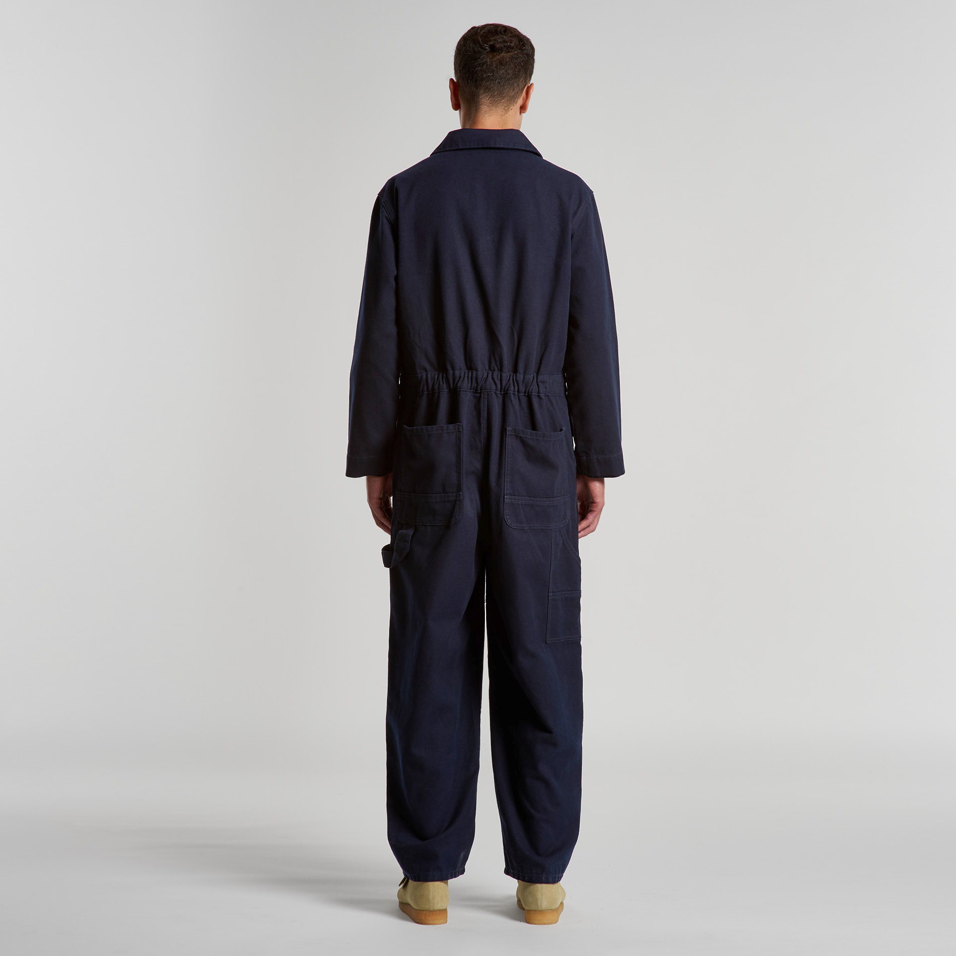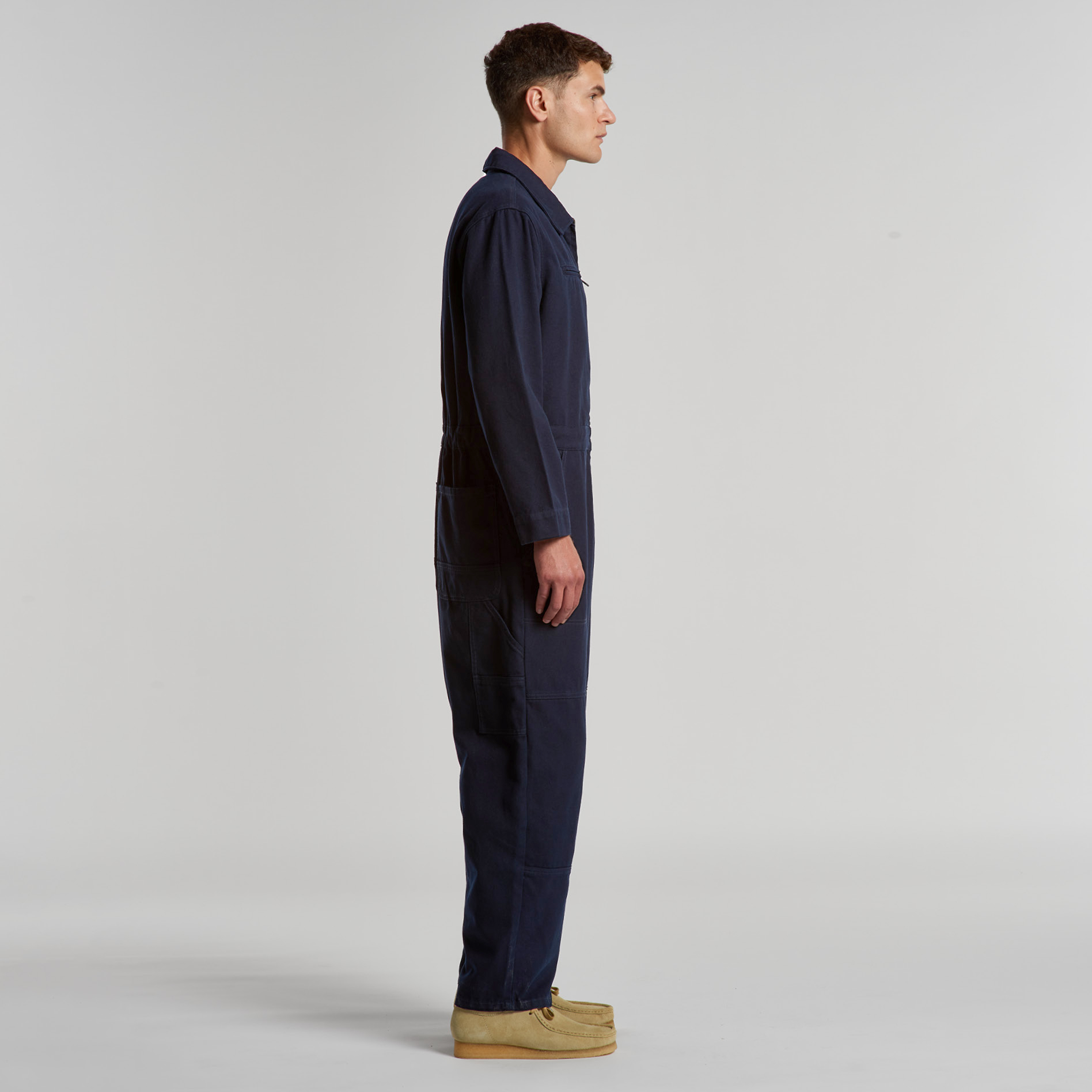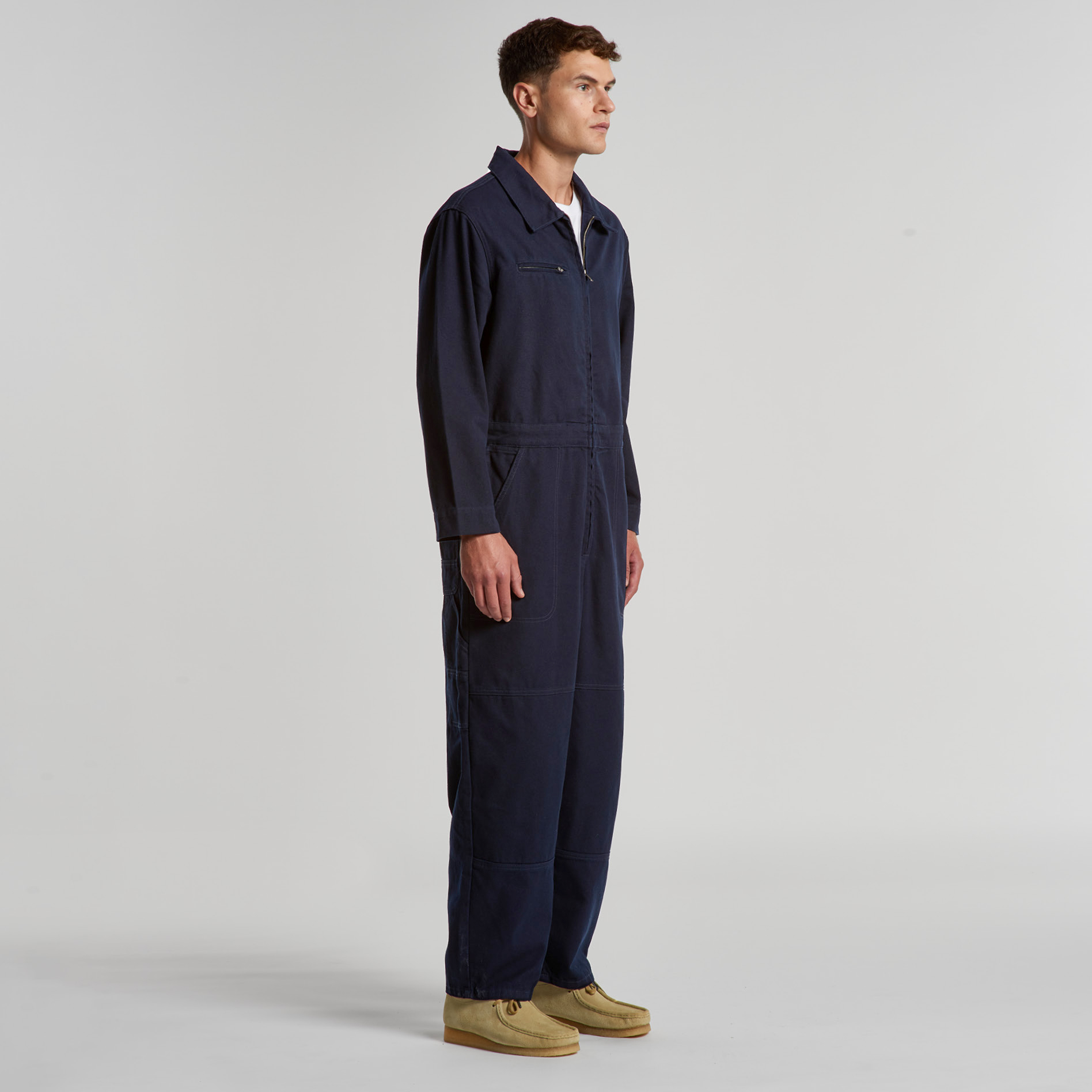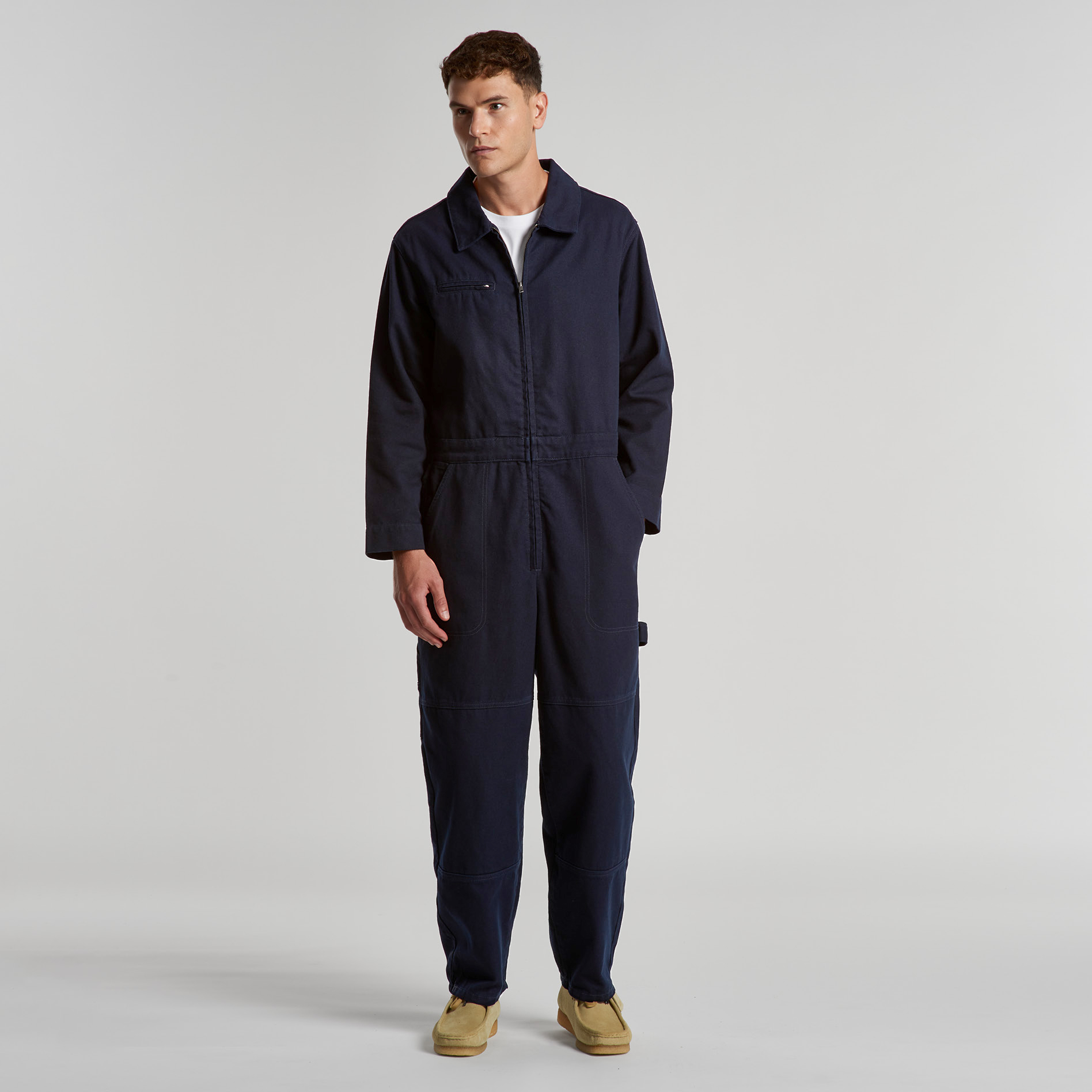 100% Cotton Duck canvas, Collared all-in-one, adjustable shoulder straps, YKK zip front, 6 pockets, top stitch detailing, Elastic at center back, hammer loop, zip close chest pocket, internal access at pocket, double patch knees